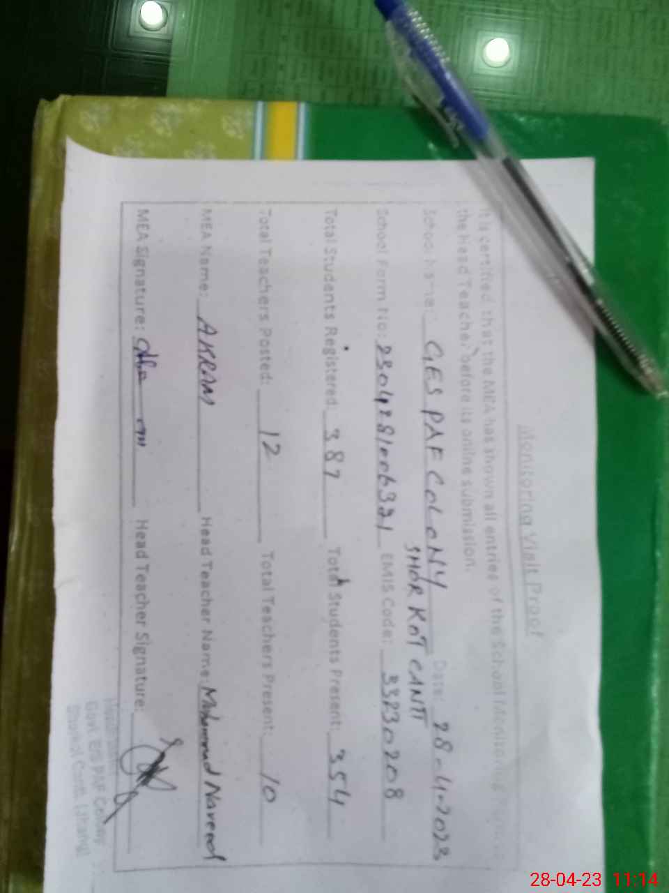 | EMIS Code: 33230208 | Name of School: GES PAF COLONY SHORKOT | |||