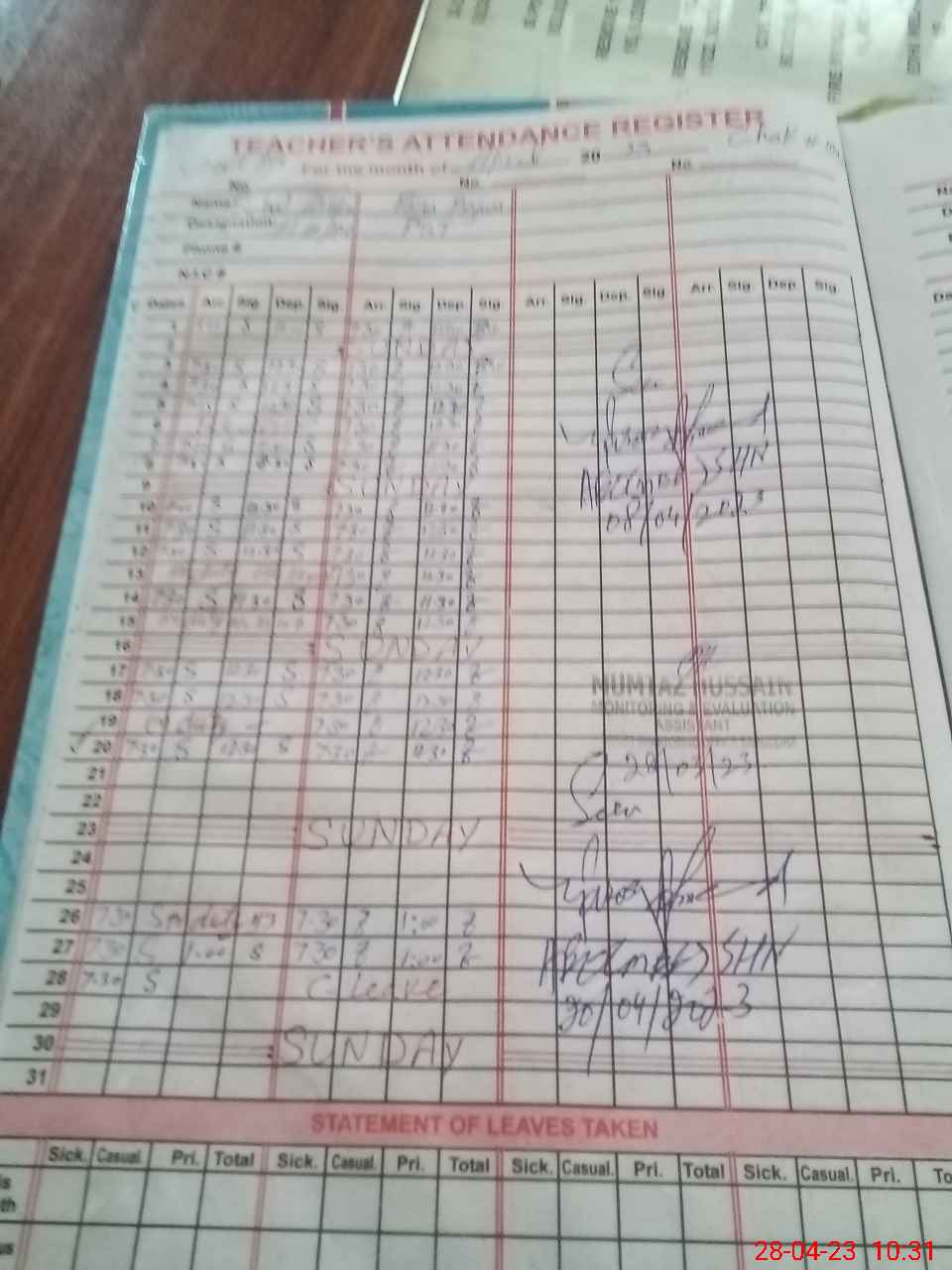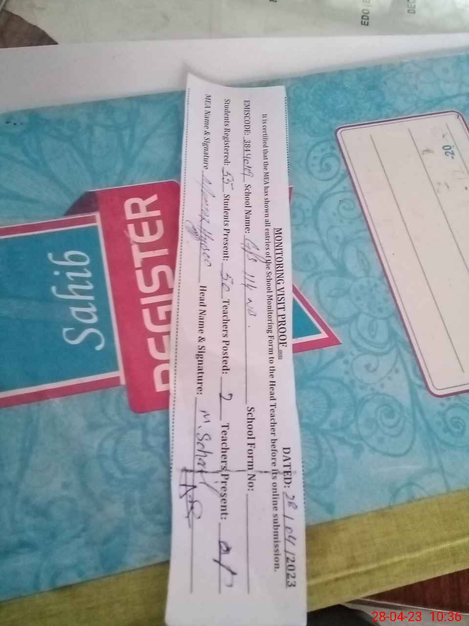 | Attendance Register | Head Teacher | MEA with School | Visit Proof |