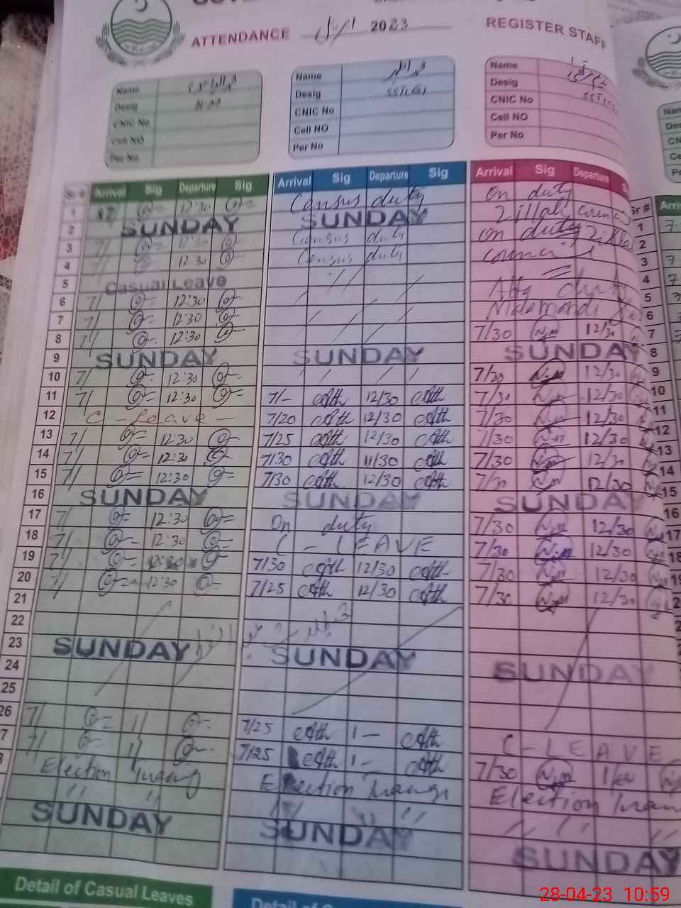 | CNIC | Full Name | Designation | R/C | Absence During Last Calender Month |