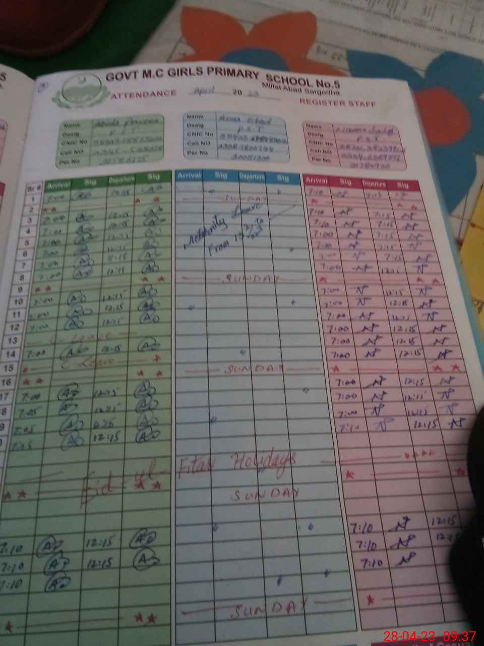| CNIC | Full Name | Designation | R/C | Absence During Last Calender Month |