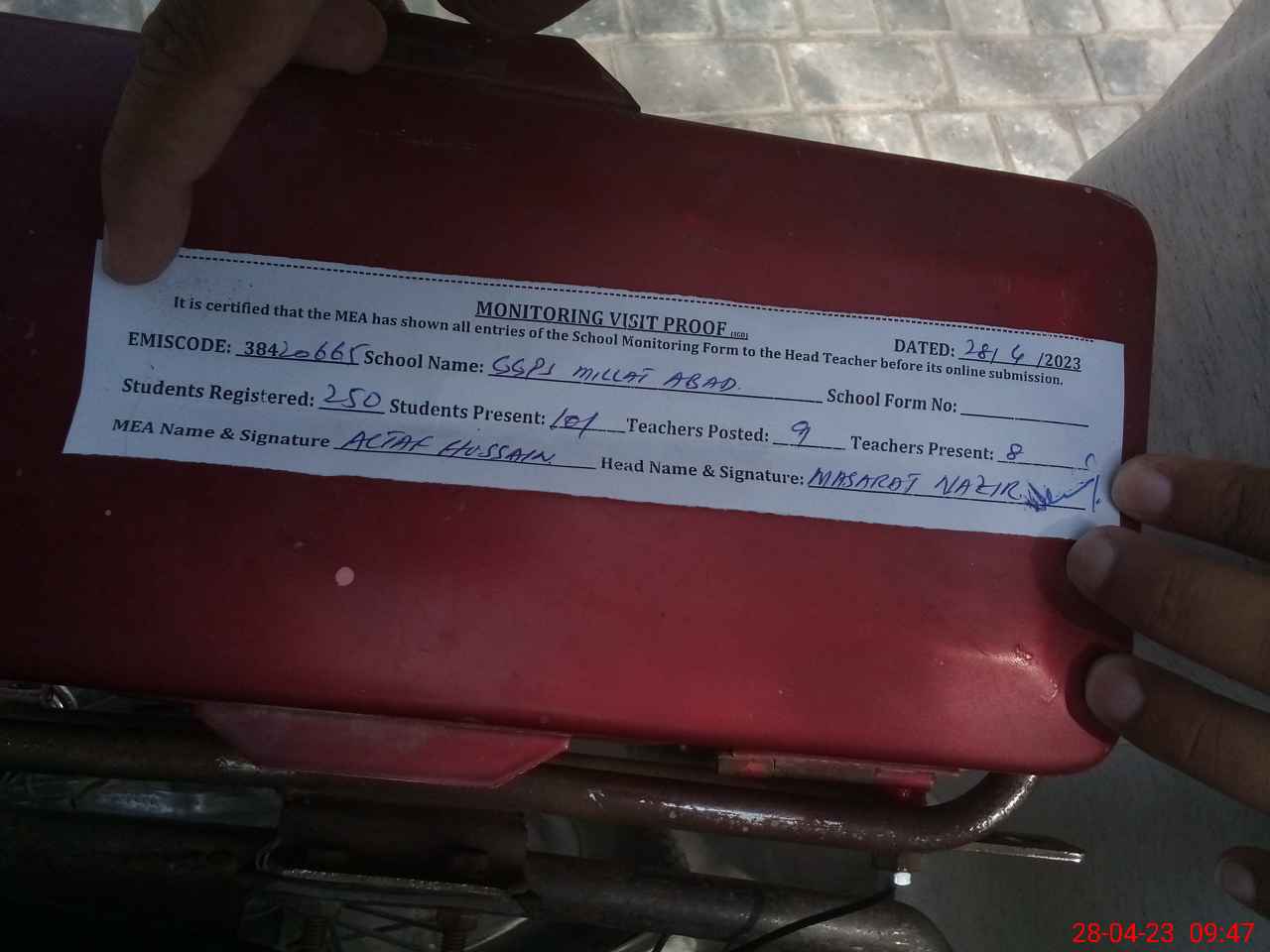 | Attendance Register | Head Teacher | MEA with School | Visit Proof |