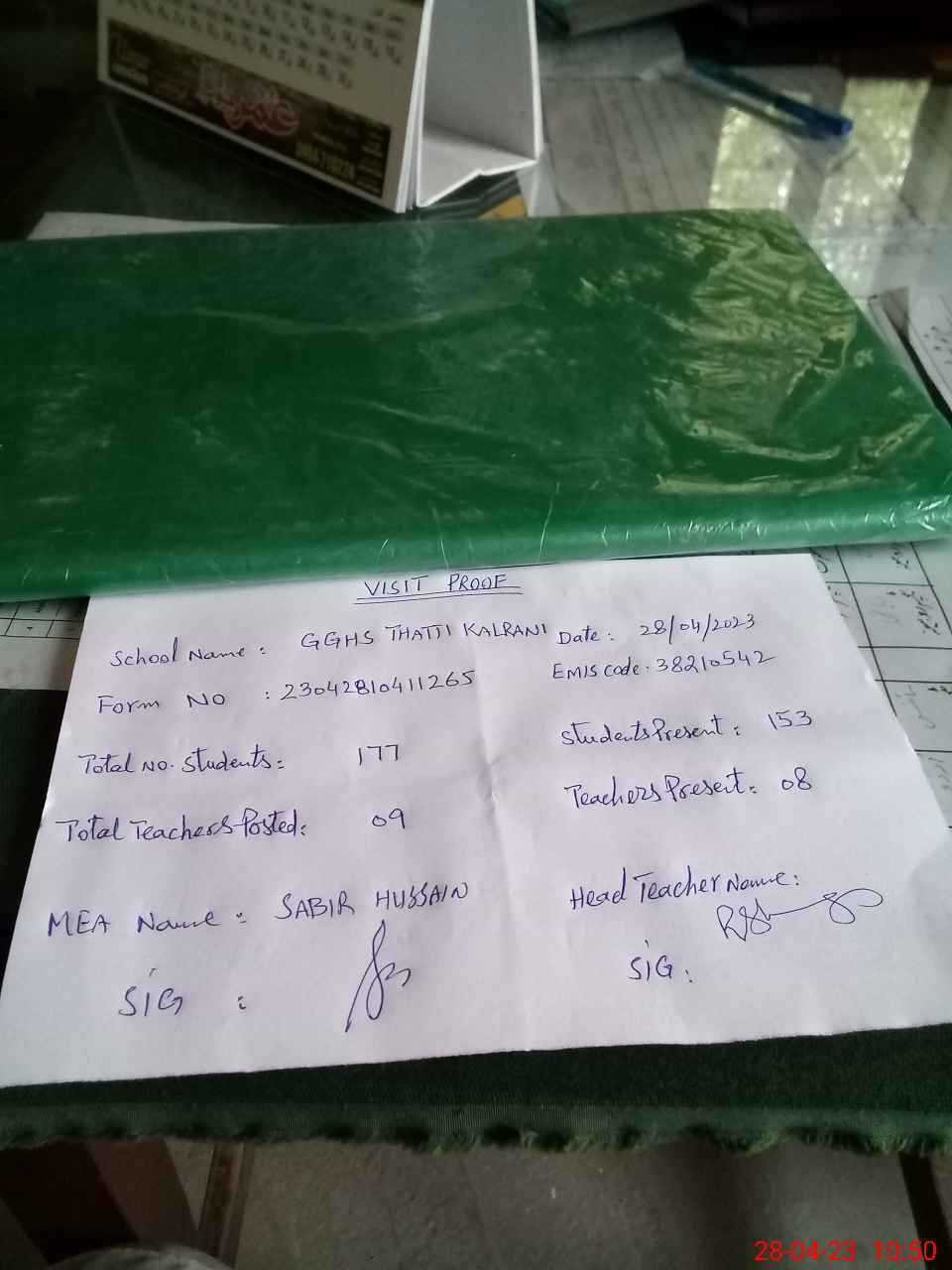 | Attendance Register | Head Teacher | MEA with School | Visit Proof |