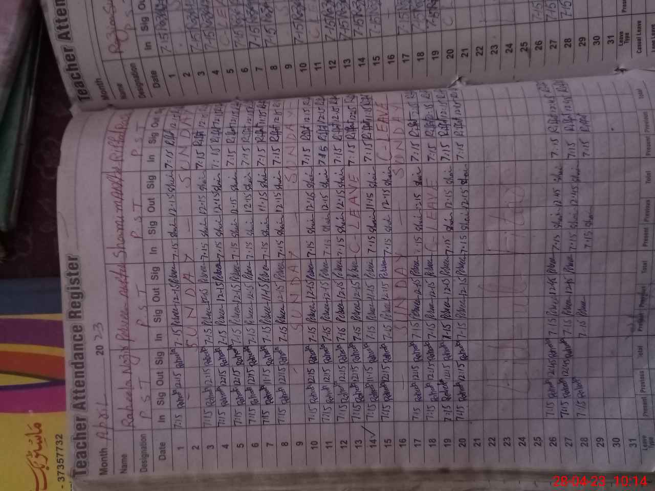 | CNIC | Full Name | Designation | R/C | Absence During Last Calender Month |