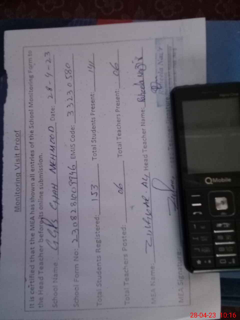 | Attendance Register | Head Teacher | MEA with School | Visit Proof |