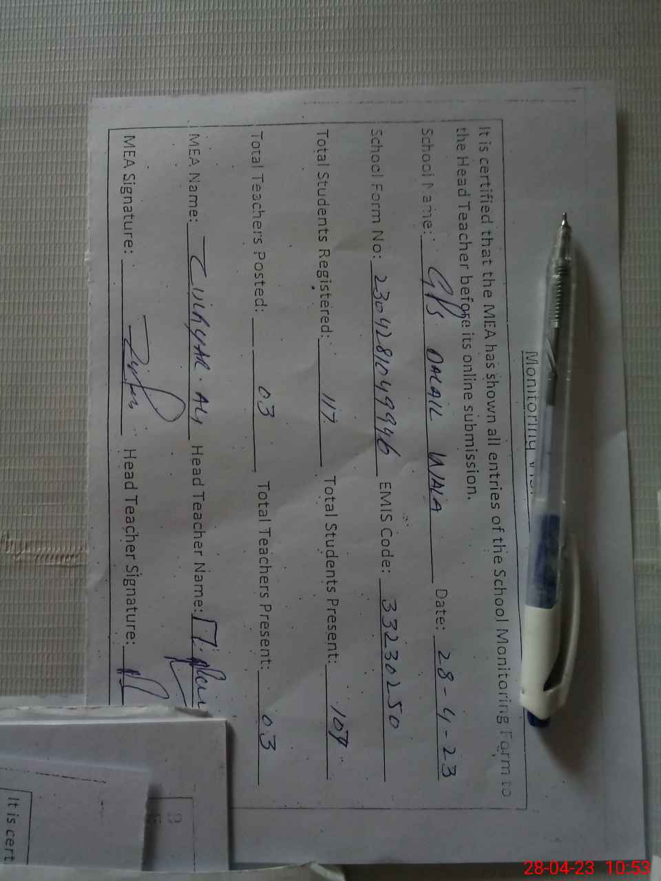 | Attendance Register | Head Teacher | MEA with School | Visit Proof |