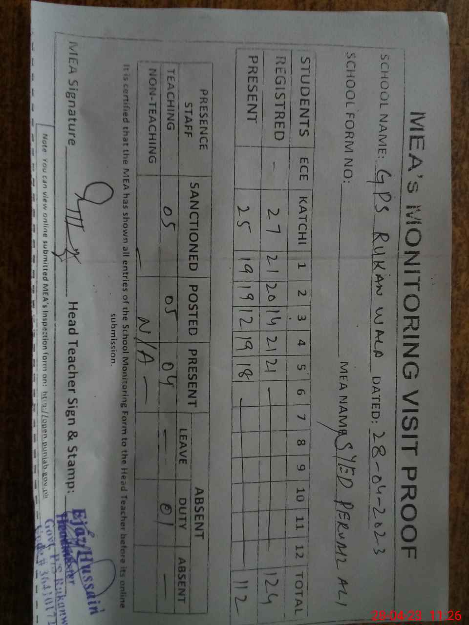 | Attendance Register | Head Teacher | MEA with School | Visit Proof |