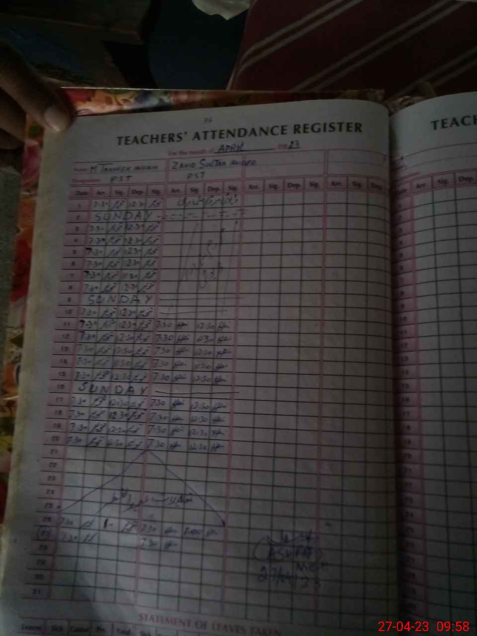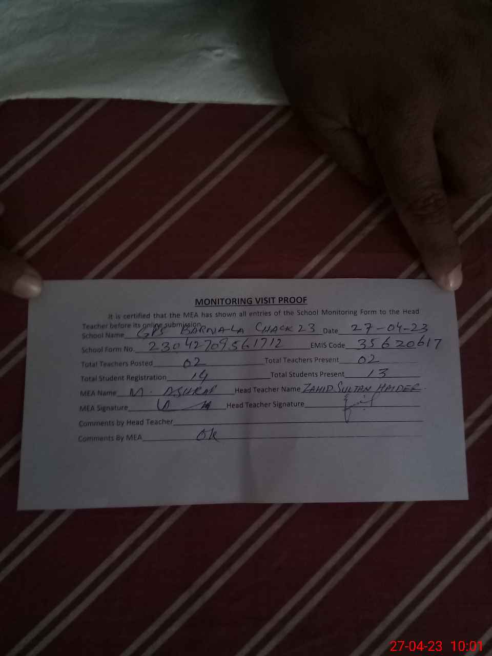 | Attendance Register | Head Teacher | MEA with School | Visit Proof |