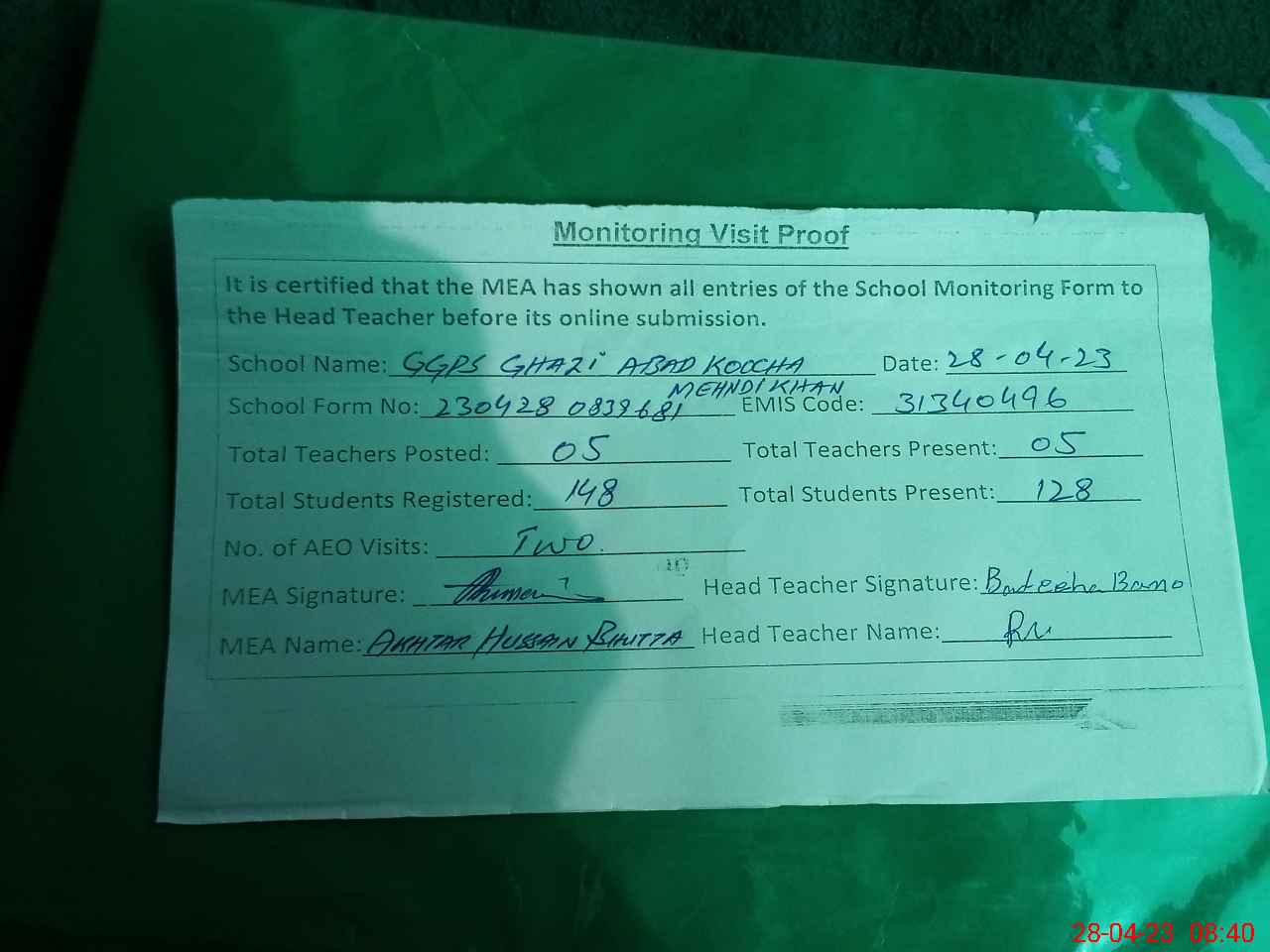 | Attendance Register | Head Teacher | MEA with School | Visit Proof |