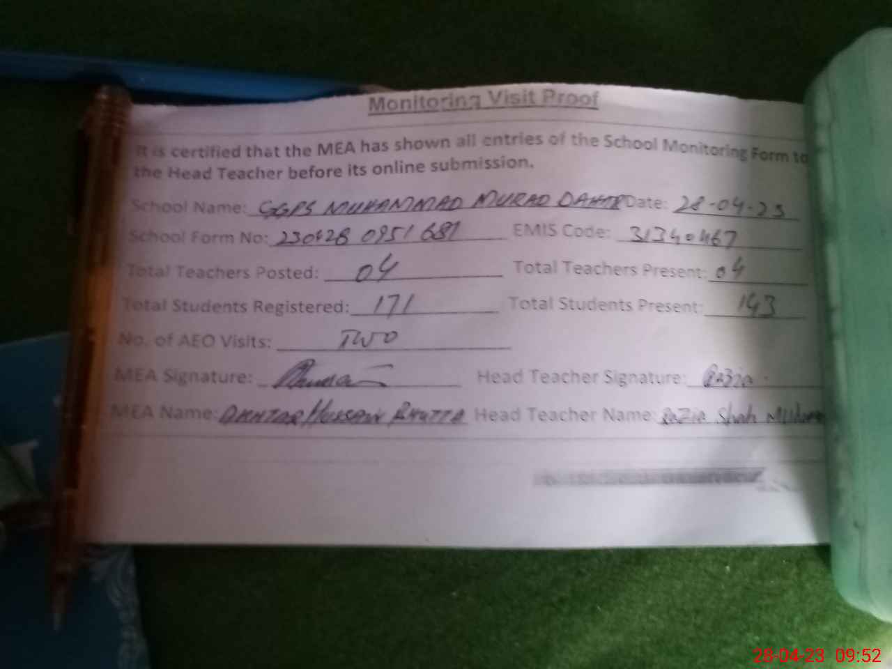 | Attendance Register | Head Teacher | MEA with School | Visit Proof |