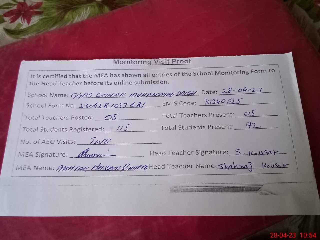 | Attendance Register | Head Teacher | MEA with School | Visit Proof |