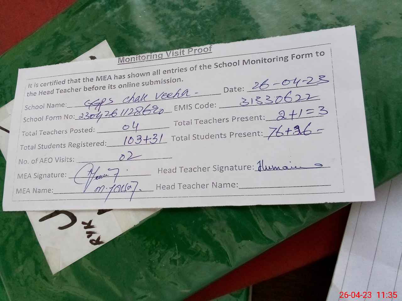 | Attendance Register | Head Teacher | MEA with School | Visit Proof |