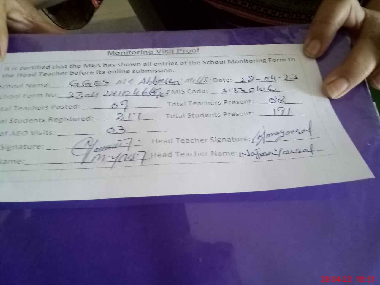 | EMIS Code: 31330106 | Name of School: GGES MC ABBASI MILLS AREA | |||