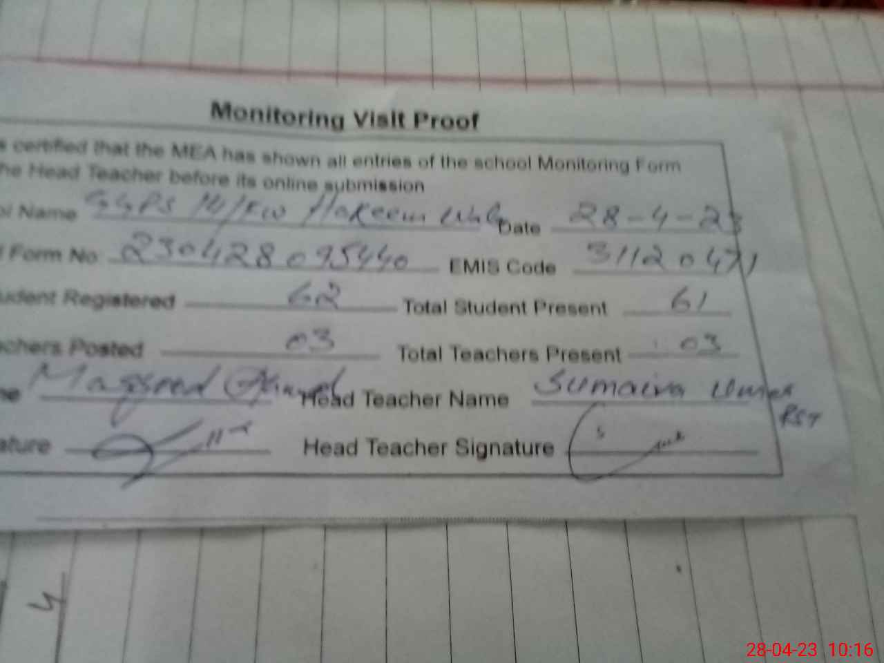 | Monitoring Date: 28-04-2023 | Start Time: 28-04-2023 09:51 AM | End Time: 28-04-2023 10:17 AM | Name of MEA: Ma**** Ah**** BN**** 20 | |