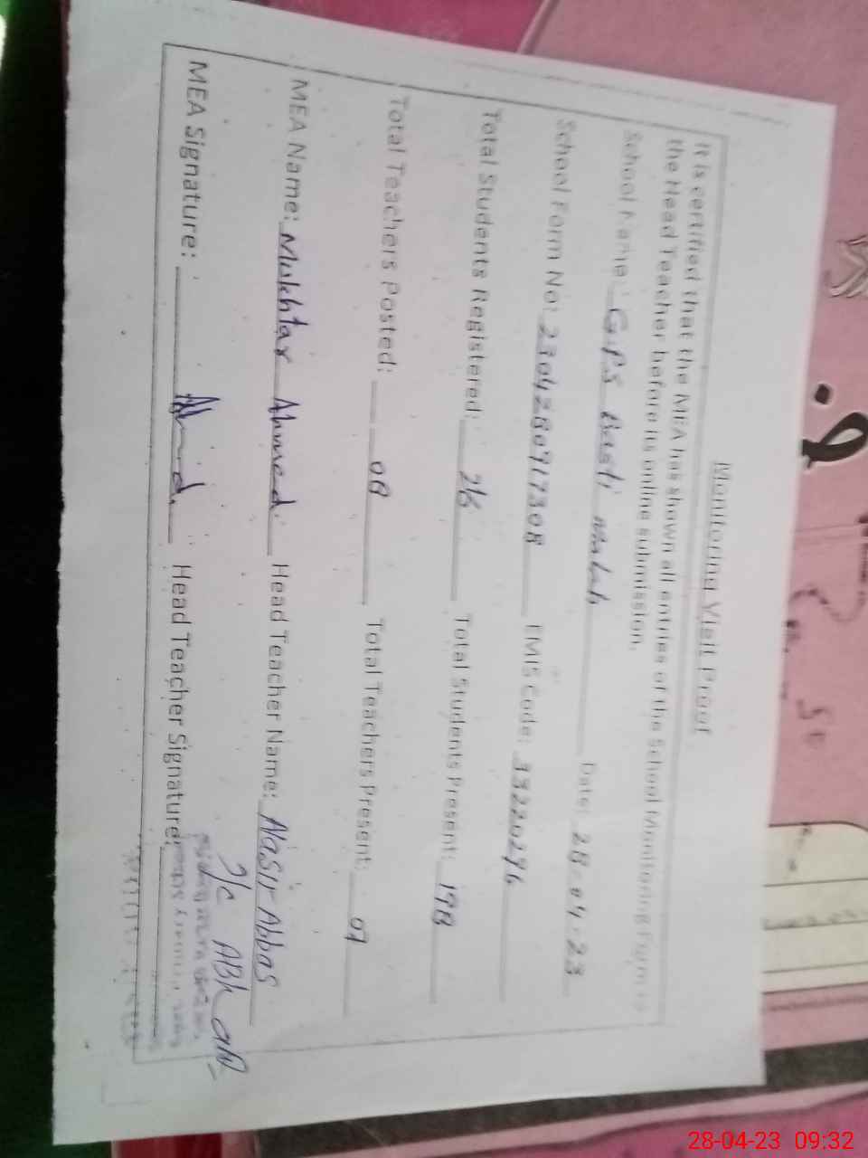 | Certified that this School was Inspected by the Undersigned MEA/DMO Today and the Information Stated Above is as Per Record. | |||||