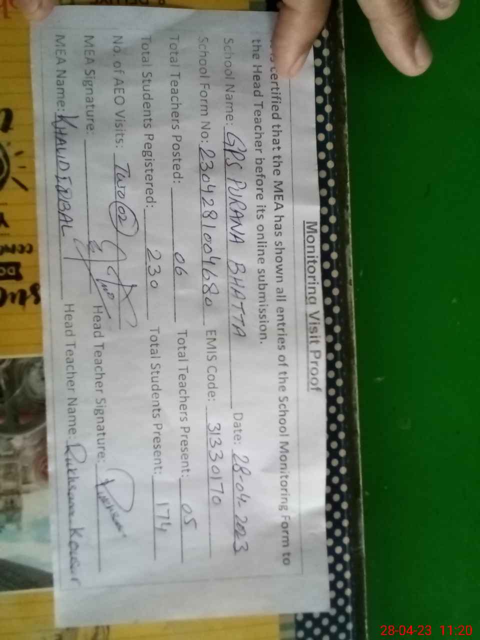 | Attendance Register | Head Teacher | MEA with School | Visit Proof |