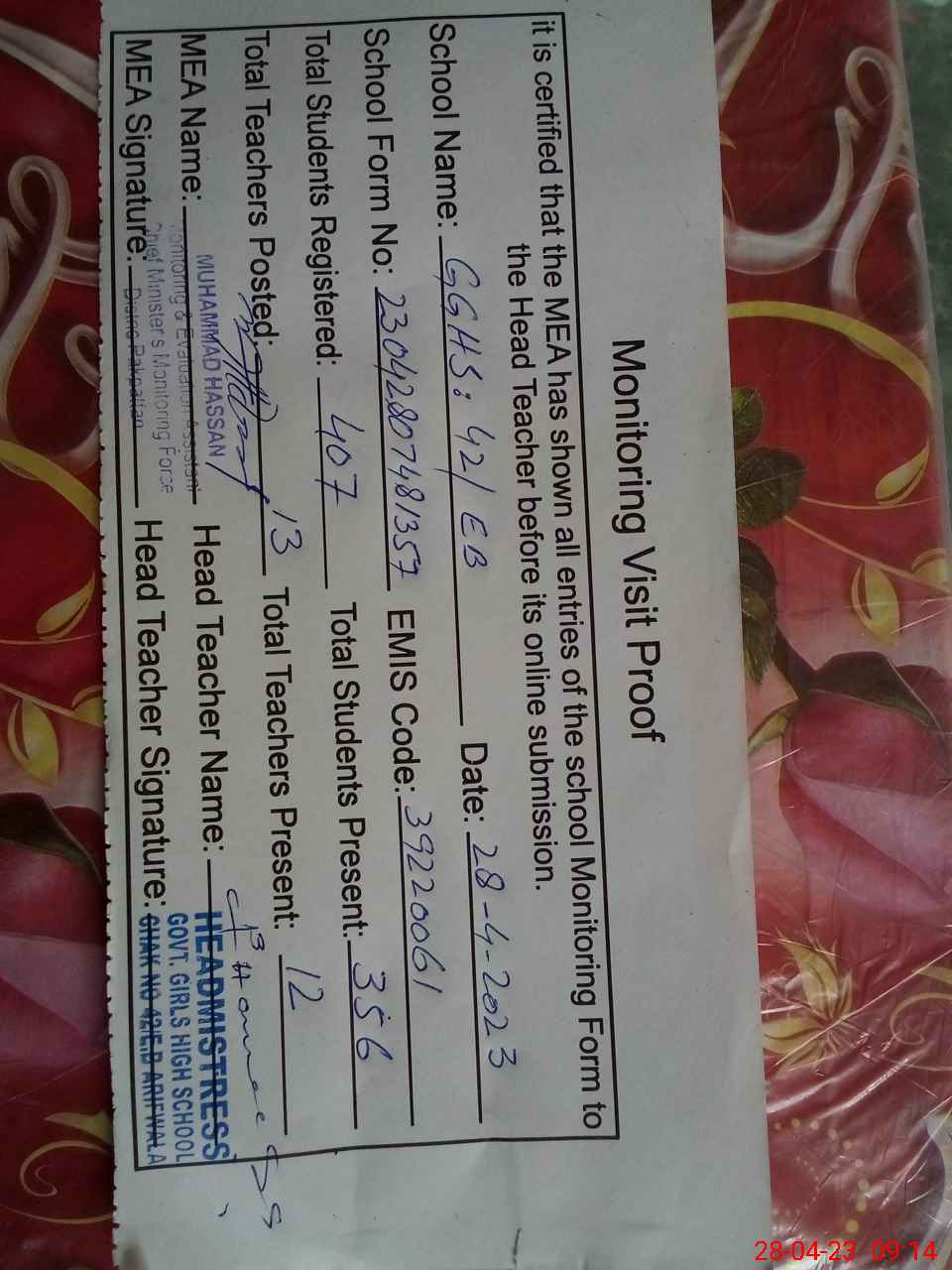 | EMIS Code: 39220061 | Name of School: GGHS 42 EB ARIFWALA | |||