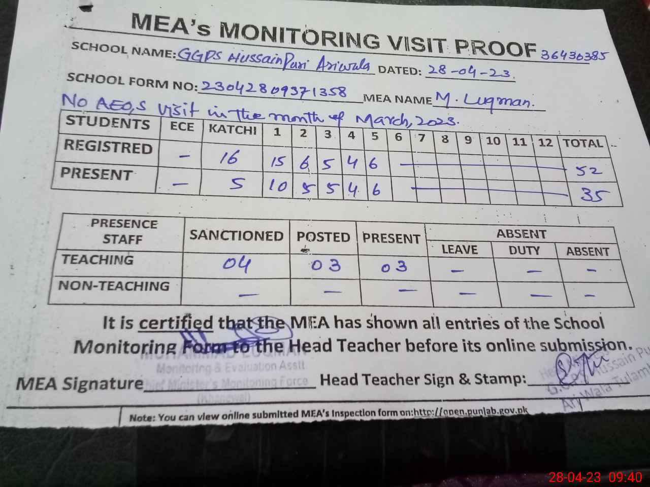 | EMIS Code: 36430385 | Name of School: GGPS HUSSAIN PUR ARI WALA, TULAMBA | |||