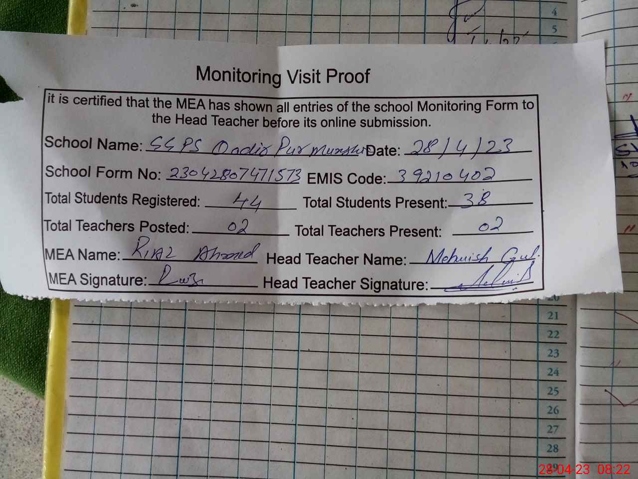 | Attendance Register | Head Teacher | MEA with School | Visit Proof |