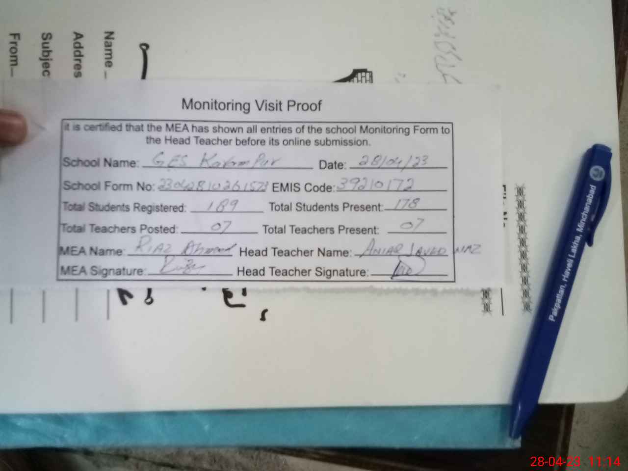 | Attendance Register | Head Teacher | MEA with School | Visit Proof |