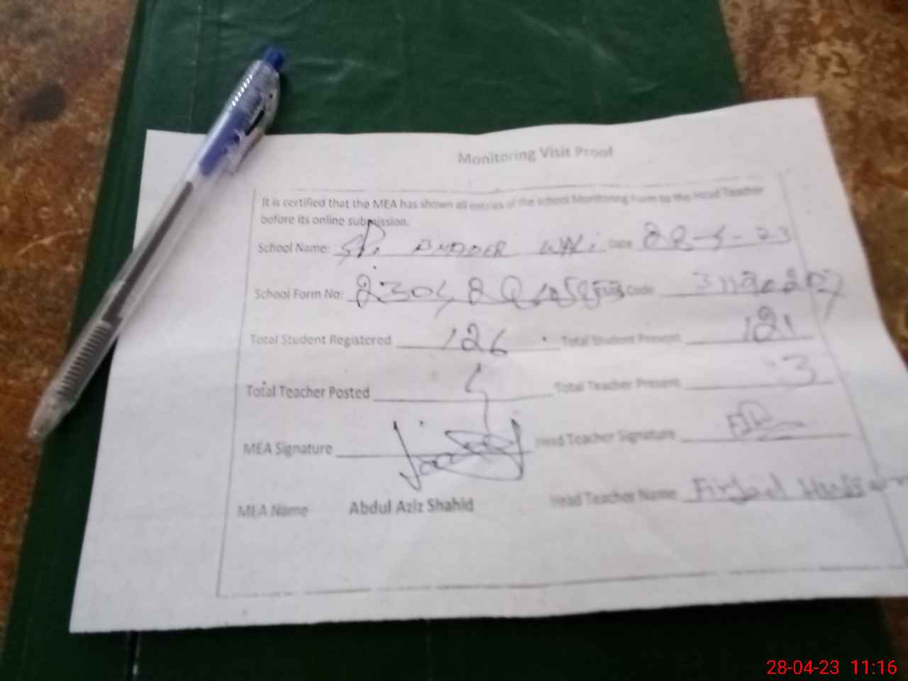 | Attendance Register | Head Teacher | MEA with School | Visit Proof |