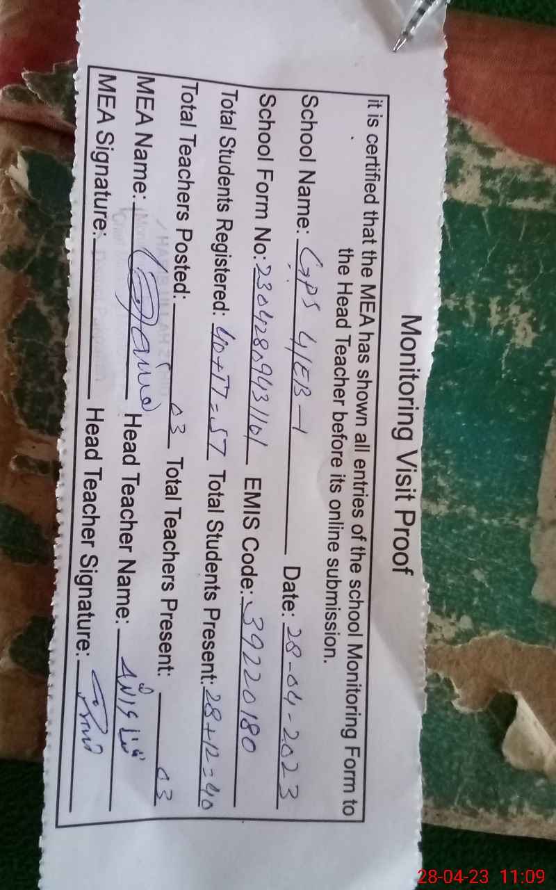 | Attendance Register | Head Teacher | MEA with School | Visit Proof |