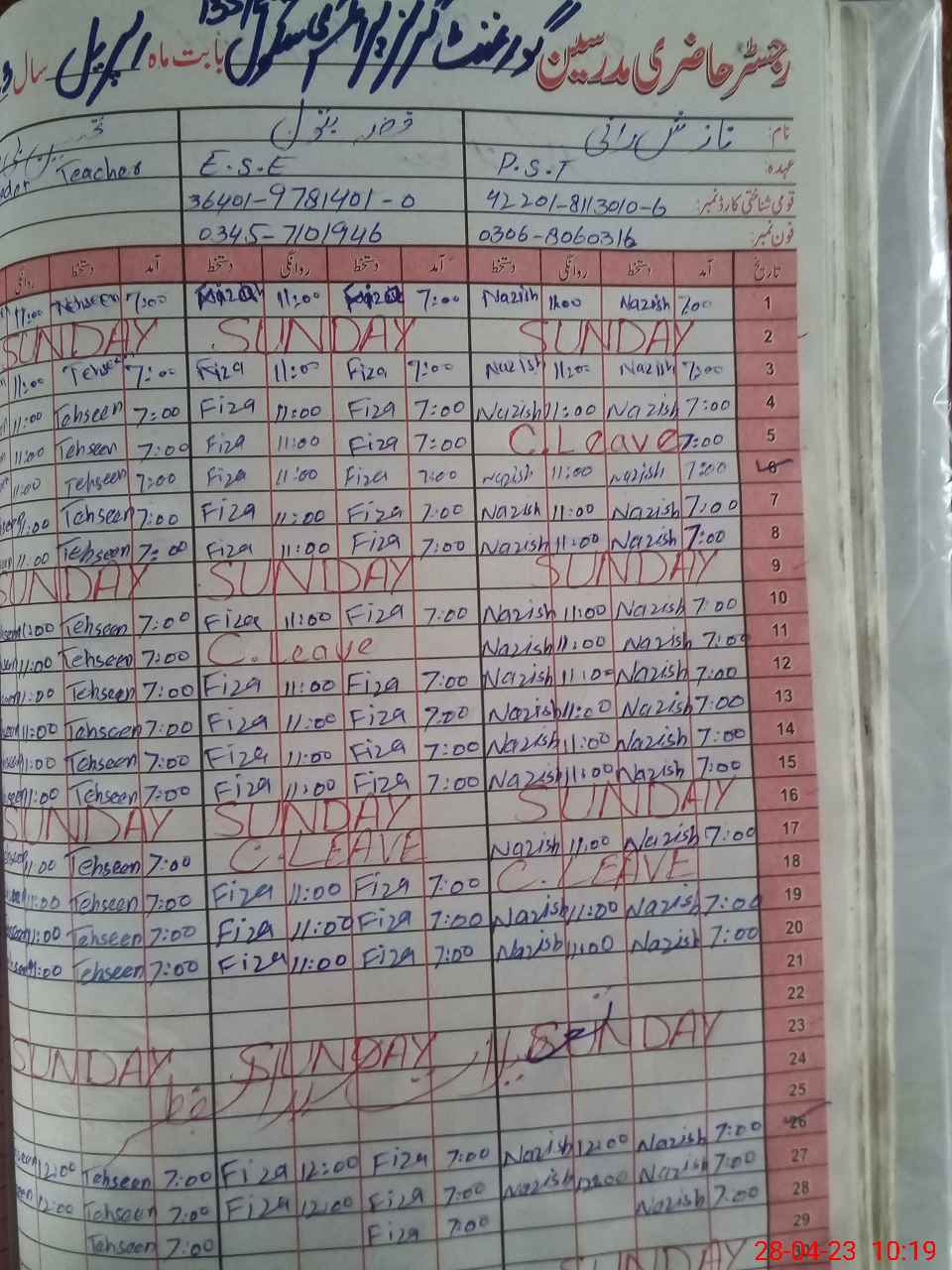 | CNIC | Full Name | Designation | R/C | Absence During Last Calender Month |