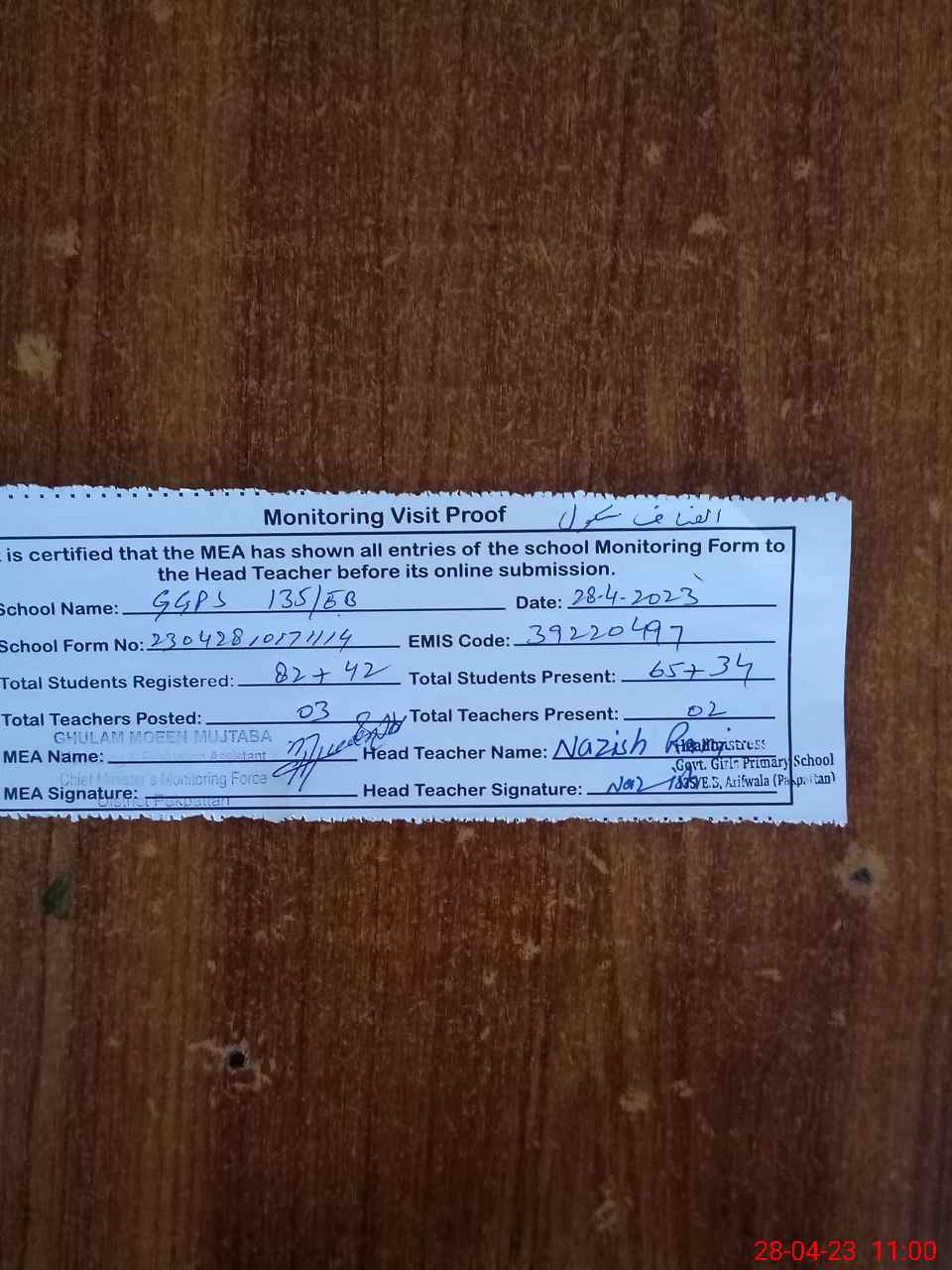 | Attendance Register | Head Teacher | MEA with School | Visit Proof |