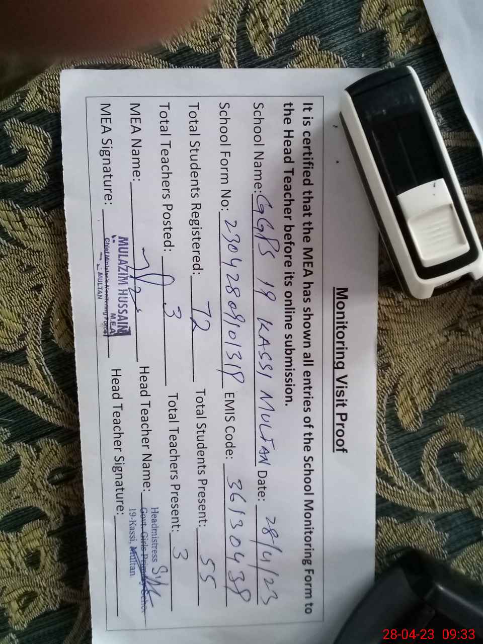 | Attendance Register | Head Teacher | MEA with School | Visit Proof |