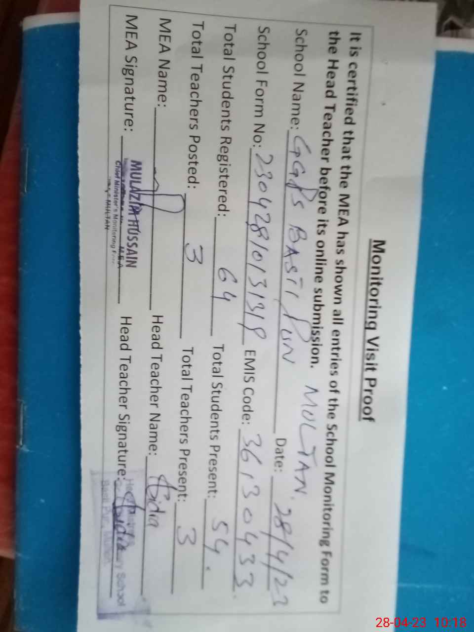 | Attendance Register | Head Teacher | MEA with School | Visit Proof |
