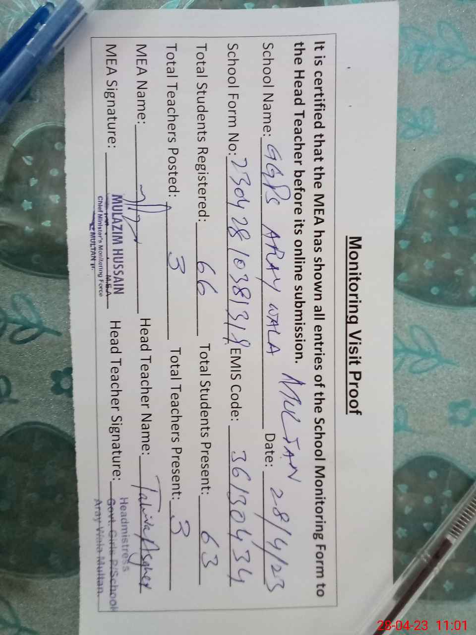 | Attendance Register | Head Teacher | MEA with School | Visit Proof |