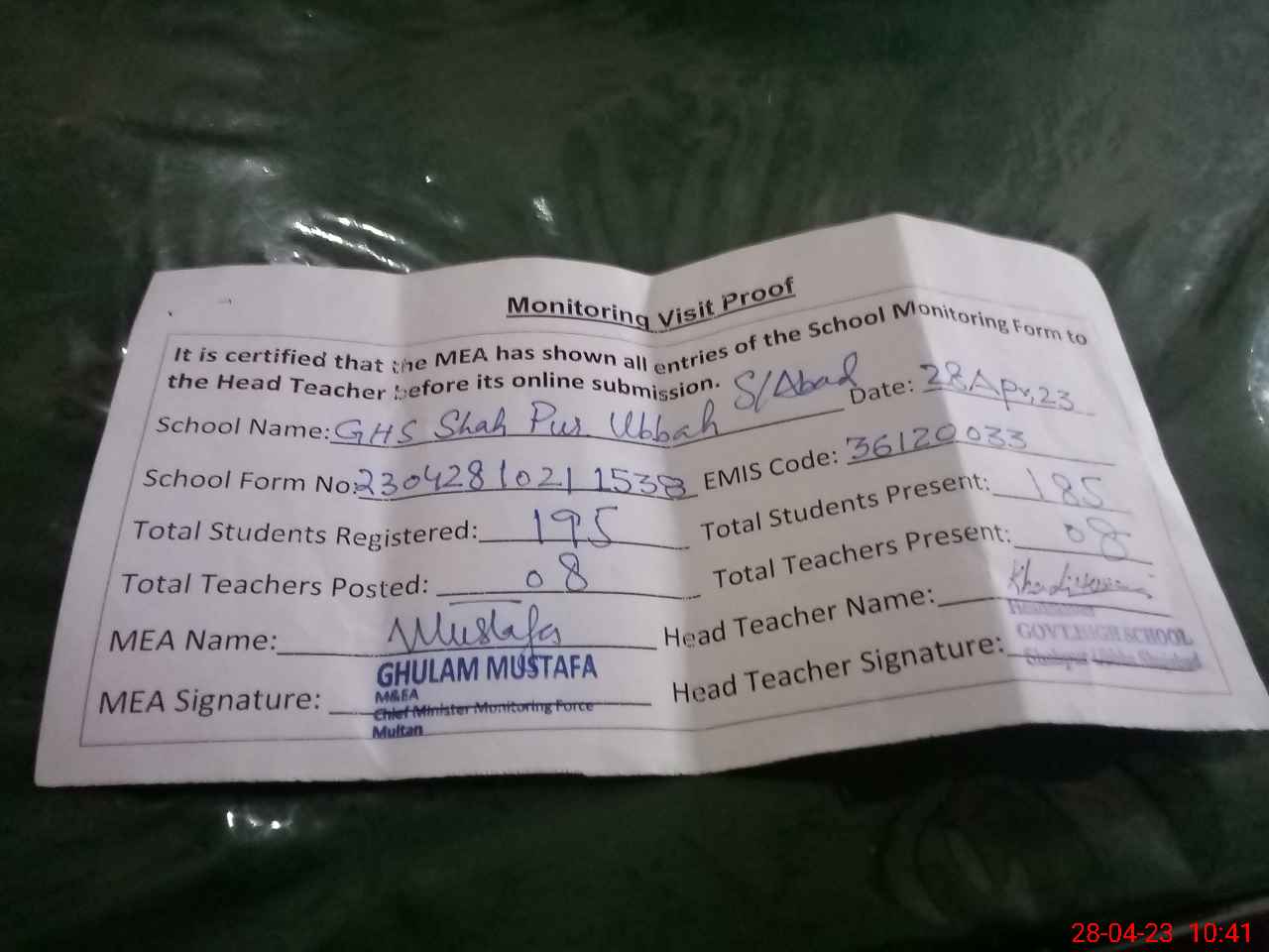 | Attendance Register | Head Teacher | MEA with School | Visit Proof |