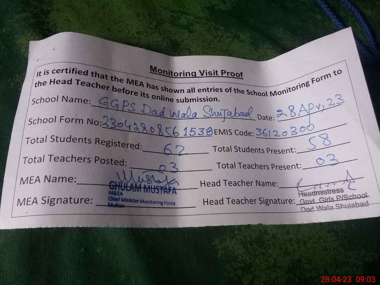 | EMIS Code: 36120300 | Name of School: GGPS DAD WALA SHUJABAD DISTT. MULTAN | |||