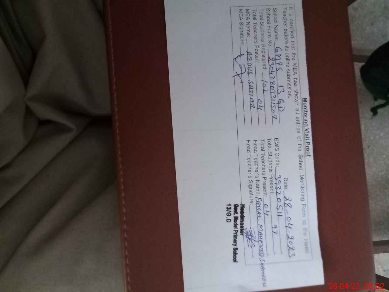 | Attendance Register | Head Teacher | MEA with School | Visit Proof |