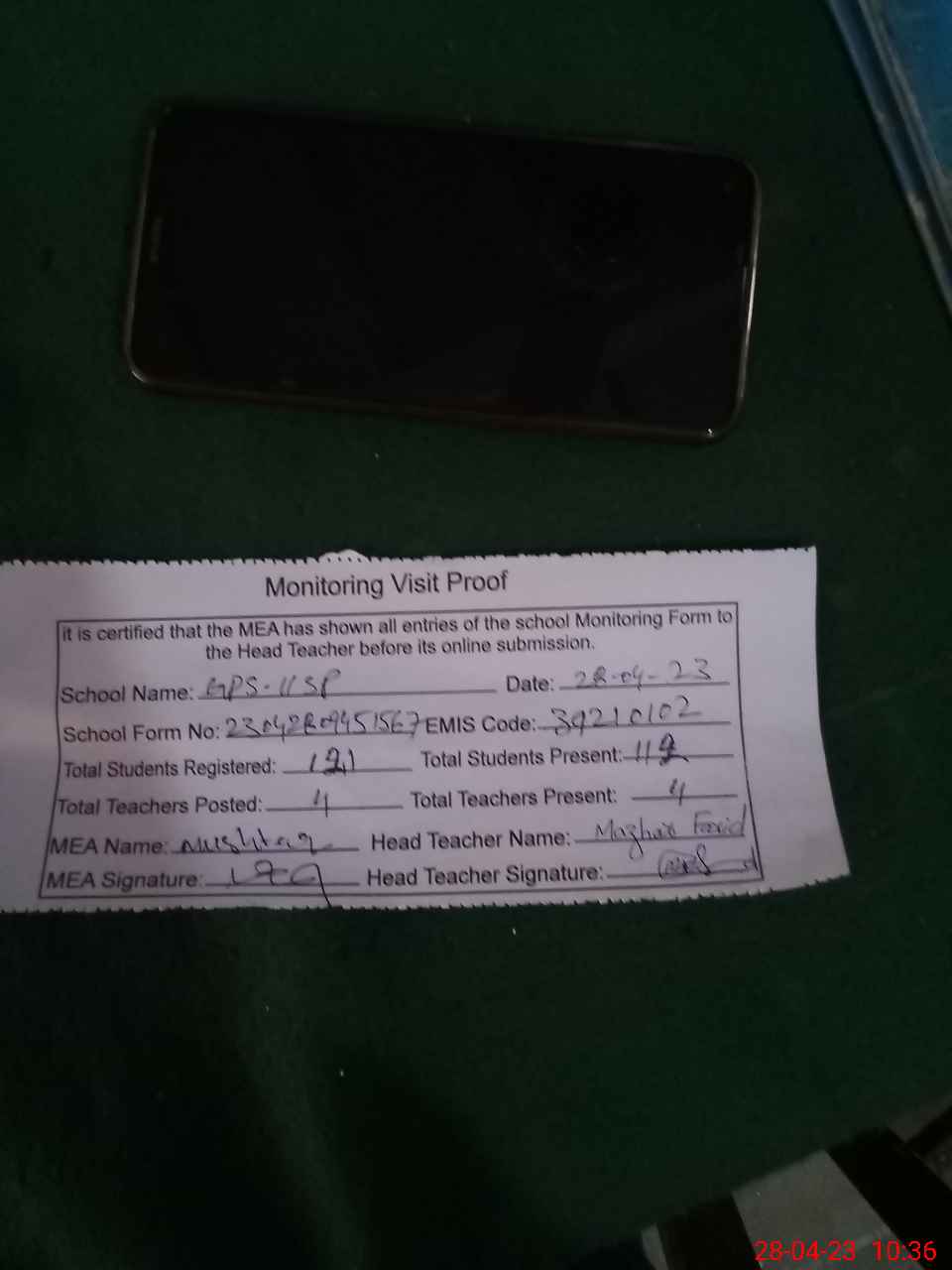 | Attendance Register | Head Teacher | MEA with School | Visit Proof |