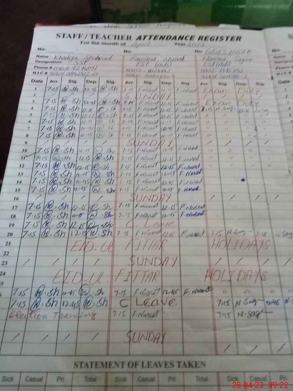 | CNIC | Full Name | Designation | R/C | Absence During Last Calender Month |
