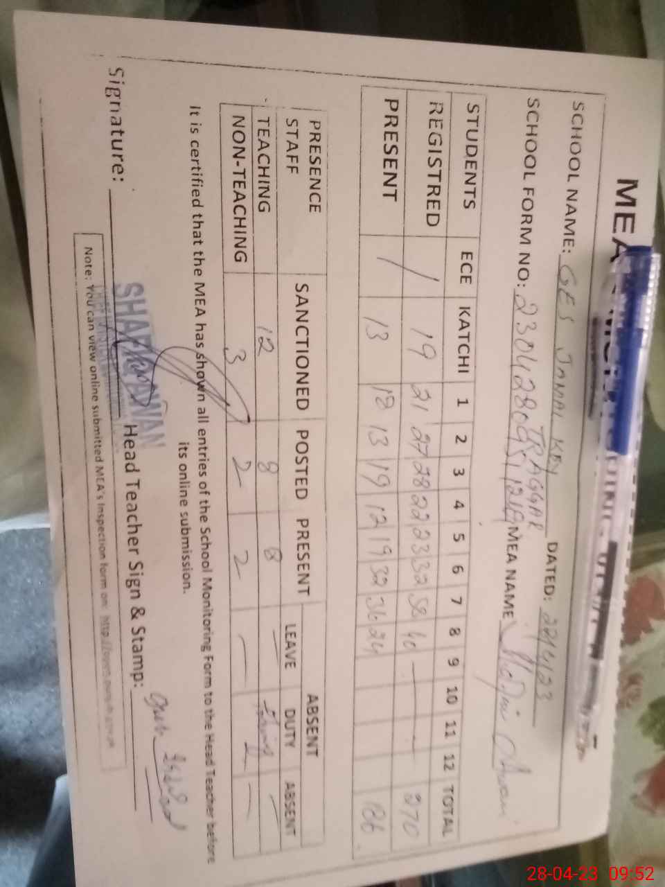 | Attendance Register | Head Teacher | MEA with School | Visit Proof |