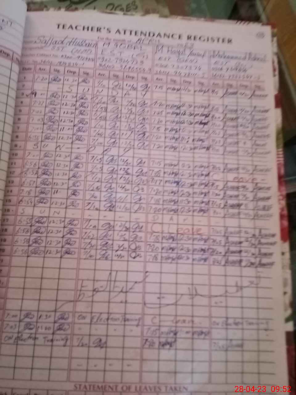 | Name: SA**** HU**** Designation: (School Headmaster's/Headmistress's) S.S.T Phone/Cell Number: 03**** |