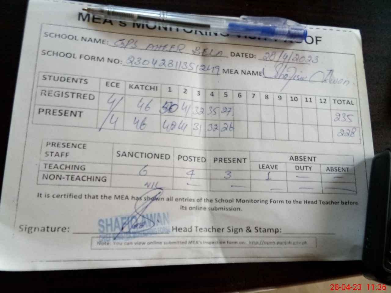 | Attendance Register | Head Teacher | MEA with School | Visit Proof |