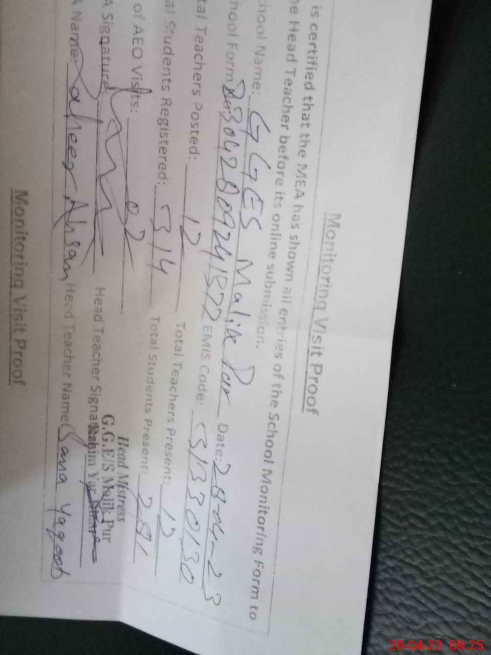 | Attendance Register | Head Teacher | MEA with School | Visit Proof |