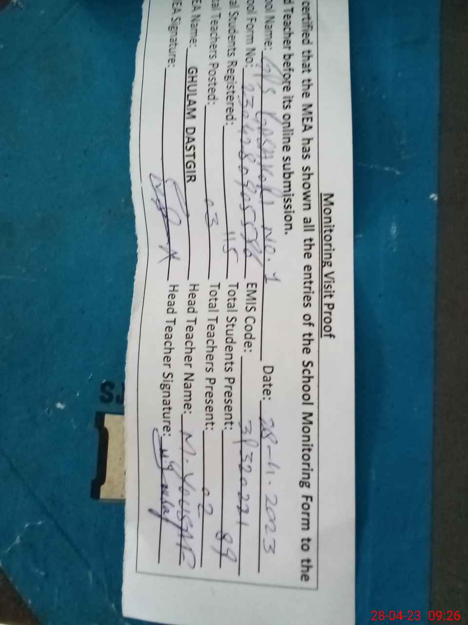 | Attendance Register | Head Teacher | MEA with School | Visit Proof |
