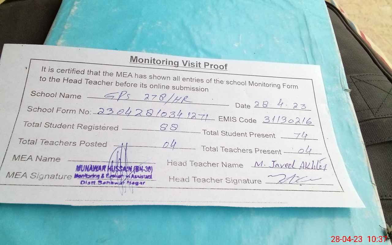 | Attendance Register | Head Teacher | MEA with School | Visit Proof |
