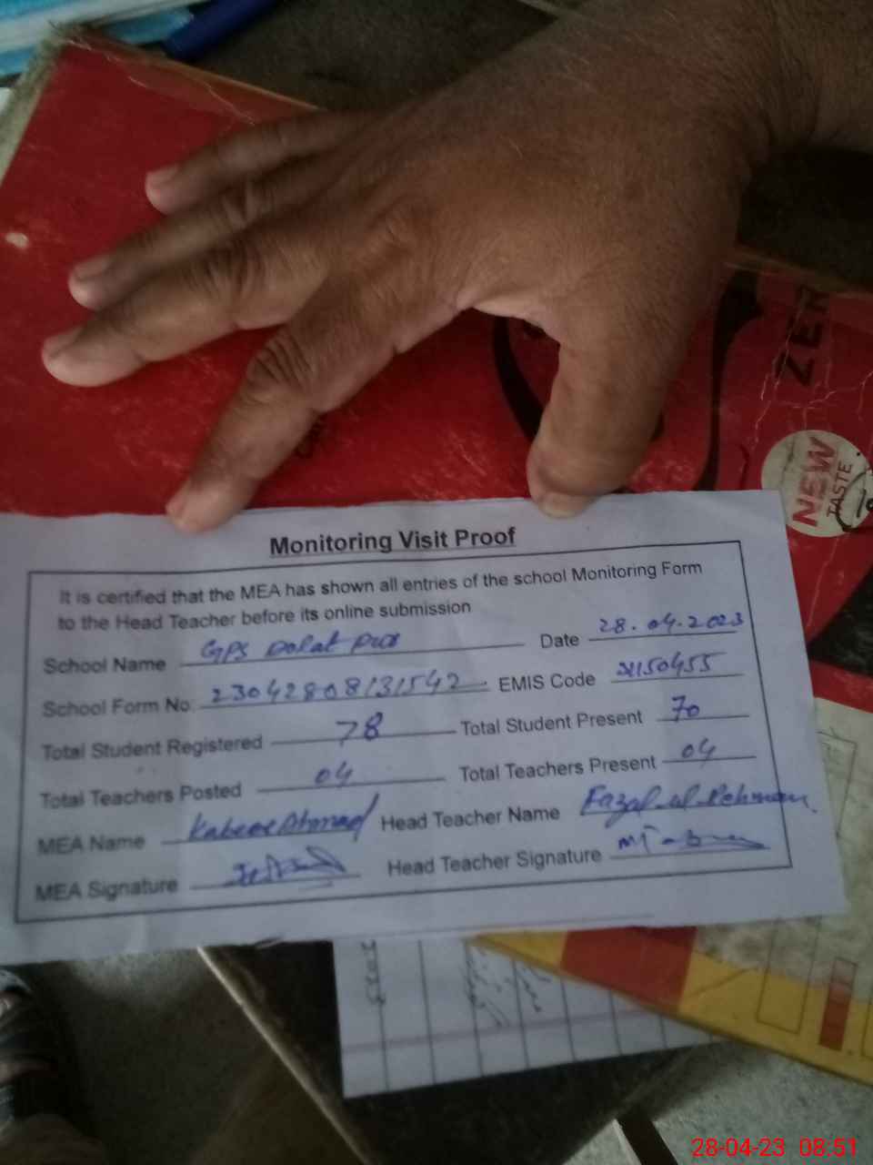 | Attendance Register | Head Teacher | MEA with School | Visit Proof |