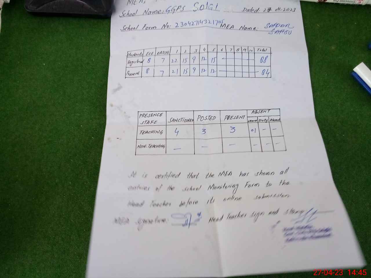 | Attendance Register | Head Teacher | MEA with School | Visit Proof |