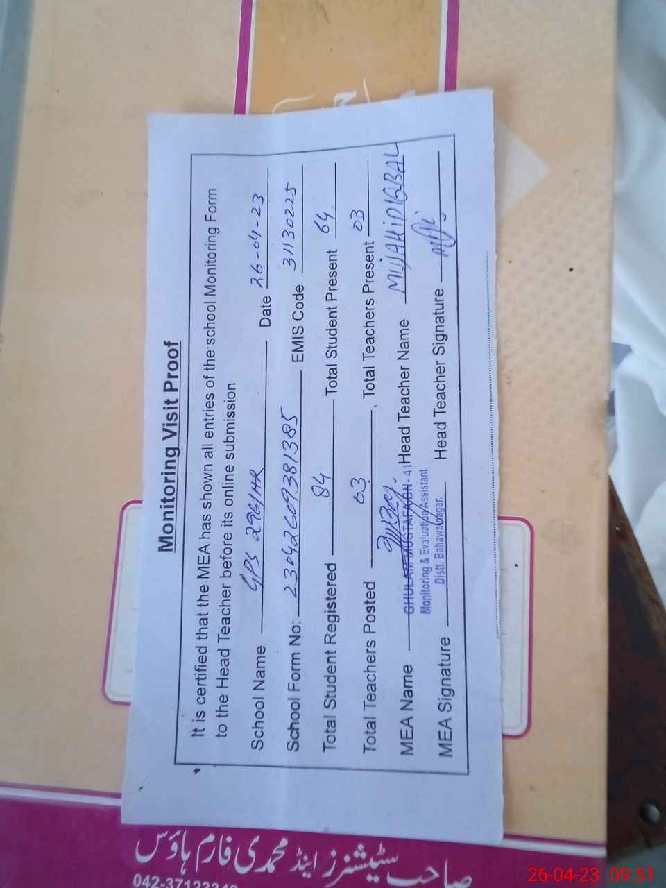 | EMIS Code: 31130225 | Name of School: GPS CHAK NO 296 HR | |||