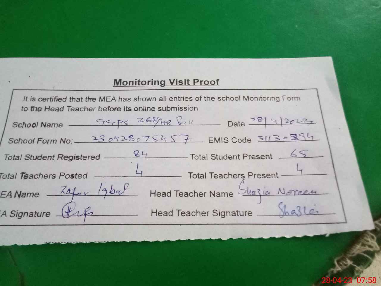 | Attendance Register | Head Teacher | MEA with School | Visit Proof |