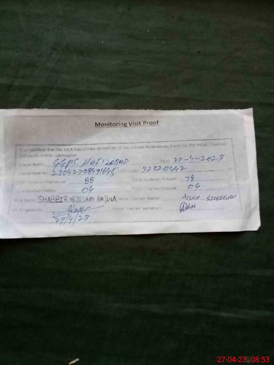 | Attendance Register | Head Teacher | MEA with School | Visit Proof |