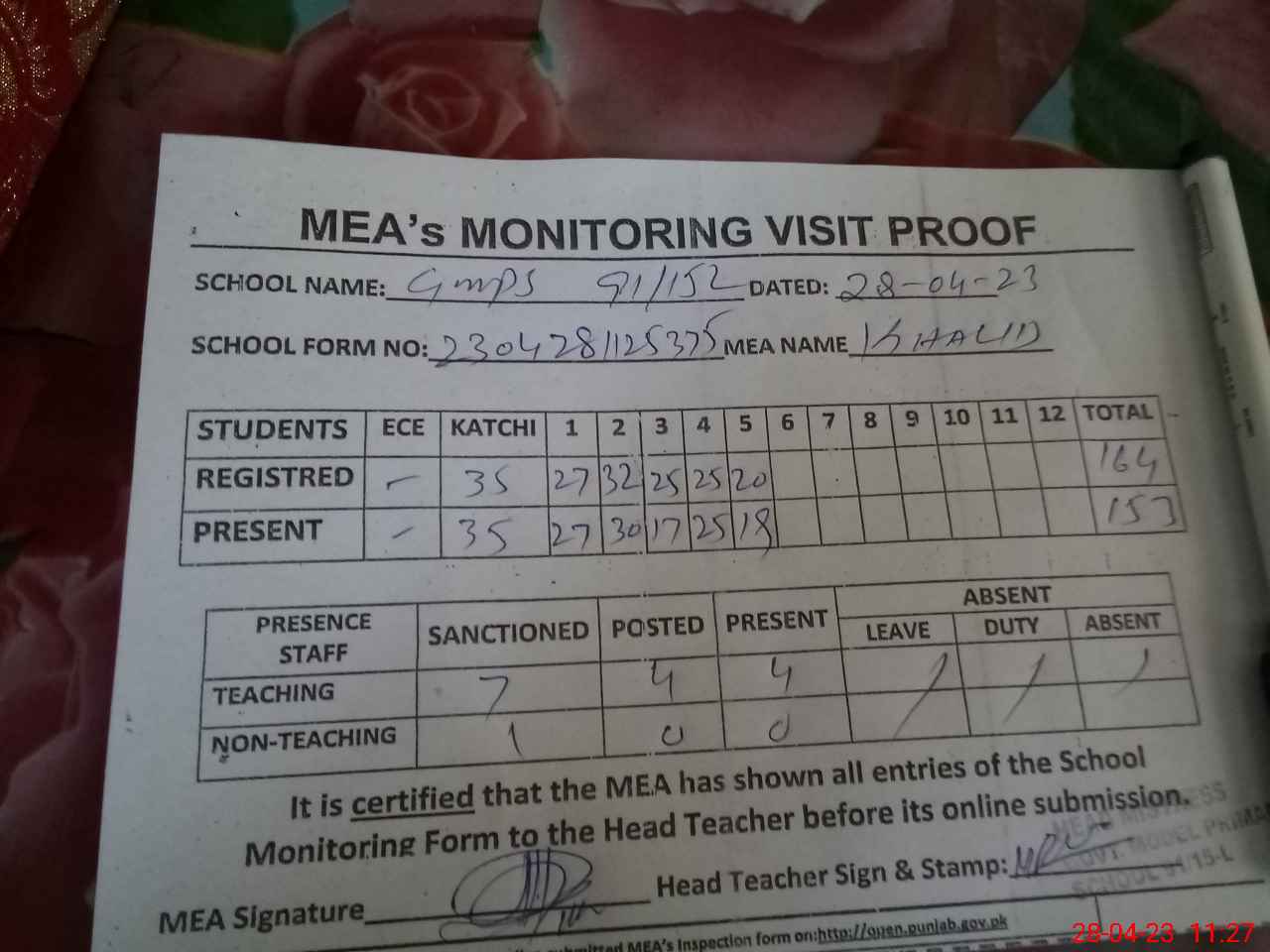 | Attendance Register | Head Teacher | MEA with School | Visit Proof |