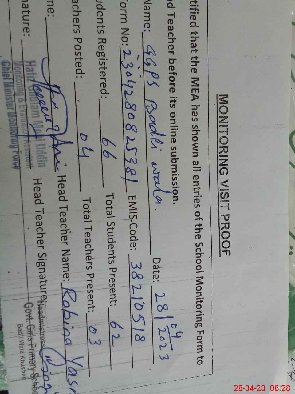 | EMIS Code: 38210518 | Name of School: GGPS BADLI WALA | |||
