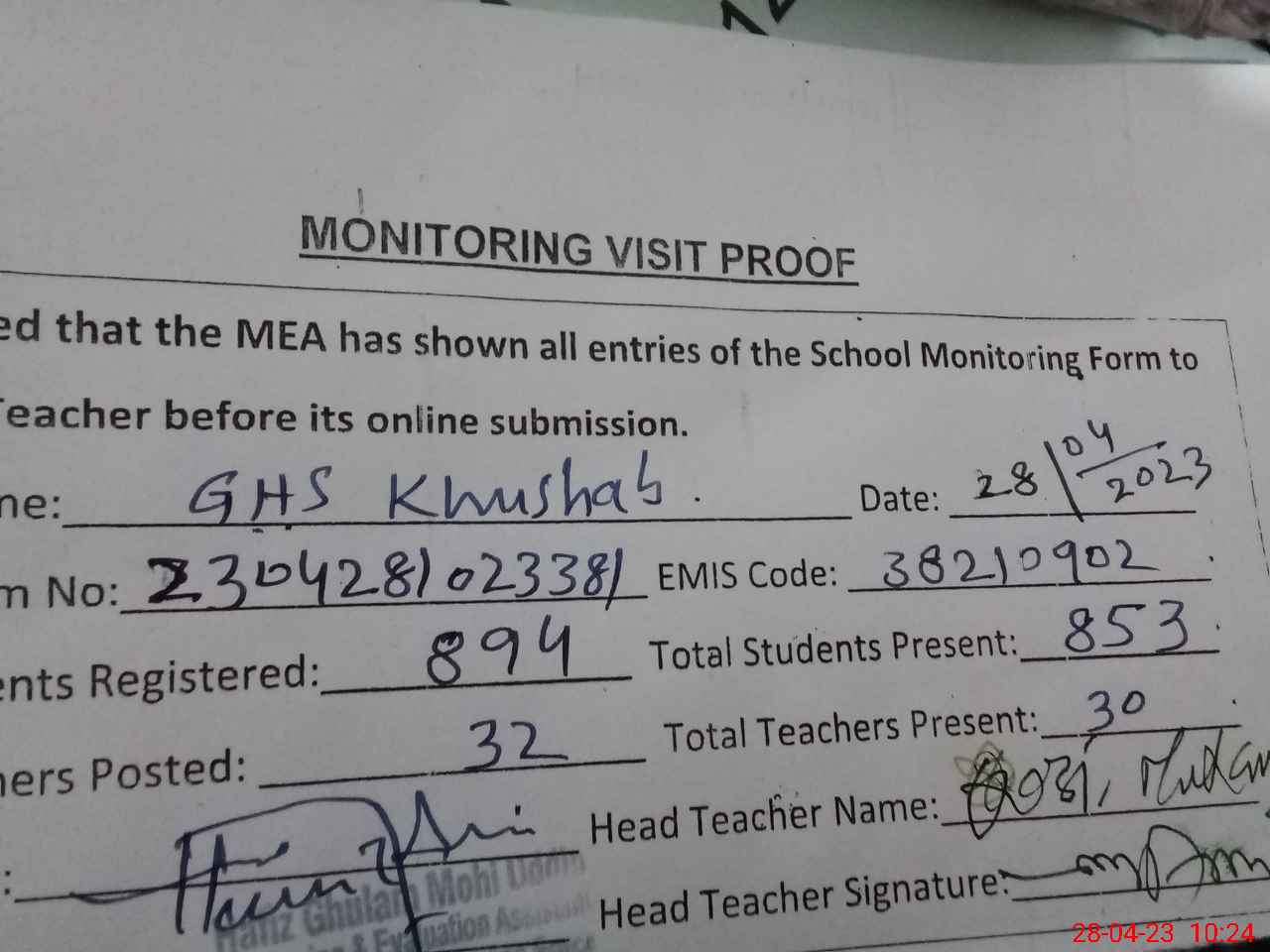 | Attendance Register | Head Teacher | MEA with School | Visit Proof |