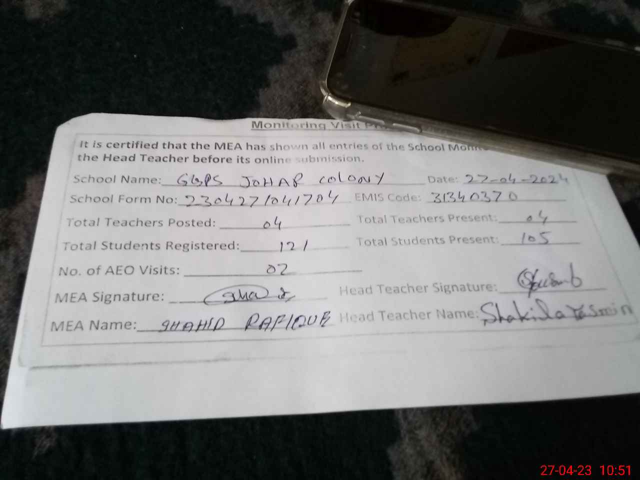 | Attendance Register | Head Teacher | MEA with School | Visit Proof |